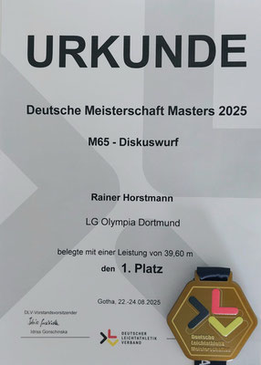 Vom 22. bis 24. August 2025 fanden in Gotha die Deutschen Meisterschaften der Masters statt – ein bedeutendes Event für die erfahrenen Athletinnen und Athleten des Landes. Mit dabei: Rainer Horstmann vom TSV Kirchlinde, der sich im Diskuswurf der Altersklasse M65 erneut behauptete und unter widrigsten Umständen einen beeindruckenden 1.Platz mit einer Weite von 39,60 Metern erzielte.